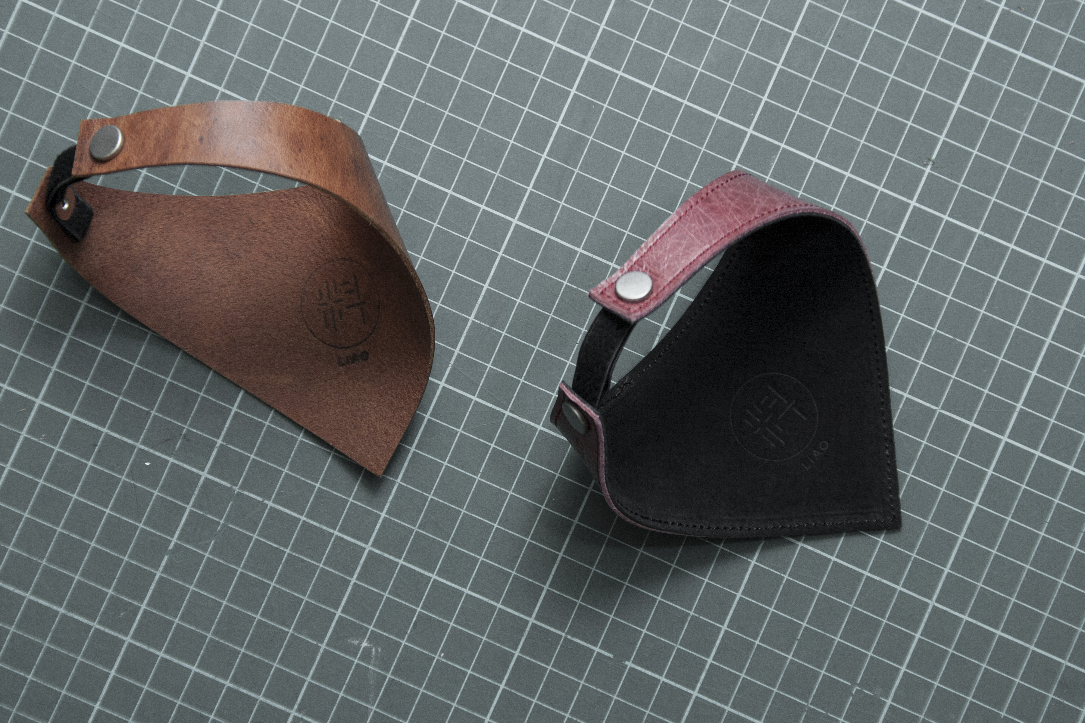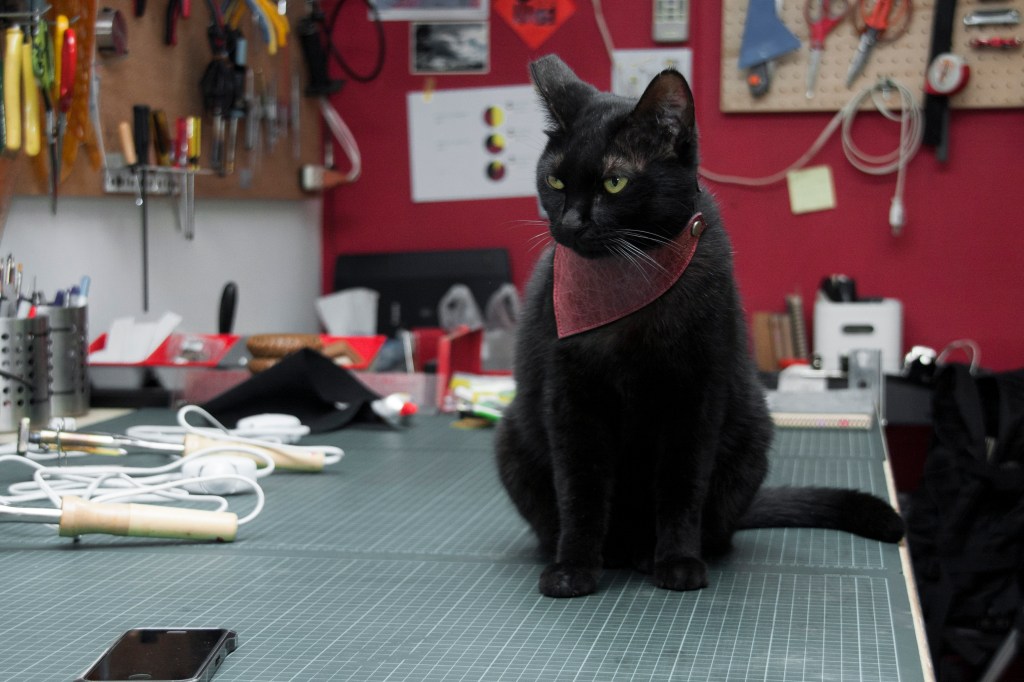 這領巾是Liao還在太原路工作室時幫室友的貓O-TI做的,因為他是放養,所以戴個領巾告訴大家他是有人養的。後來離開太原路,就沒有繼續幫O-TI做領巾了(他常常弄丟弄舊,一個月大概換3個)。後來在Liao的貓常去的醫院「小小貓動物醫院」,認識了院貓「璐璐」,Liao就開始幫他做領巾了,話說他也是隻黑貓,從此領巾從「O-TI 三角皮革領巾」改名為「院貓璐璐 三角皮革領巾」。