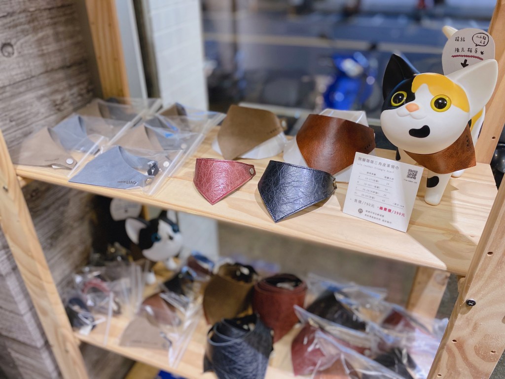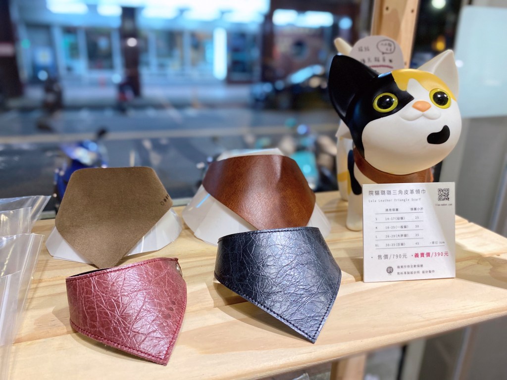 初始太原路工作室的貓,因為會時常跑出去玩,避免走失,所以幫他設計了一款領巾。領巾有各種尺寸,以鬆緊帶固定脖圍,防止因勾扯造成危險。並以版型的調整,怎麼戴都會是斜一邊噢!帥帥的。