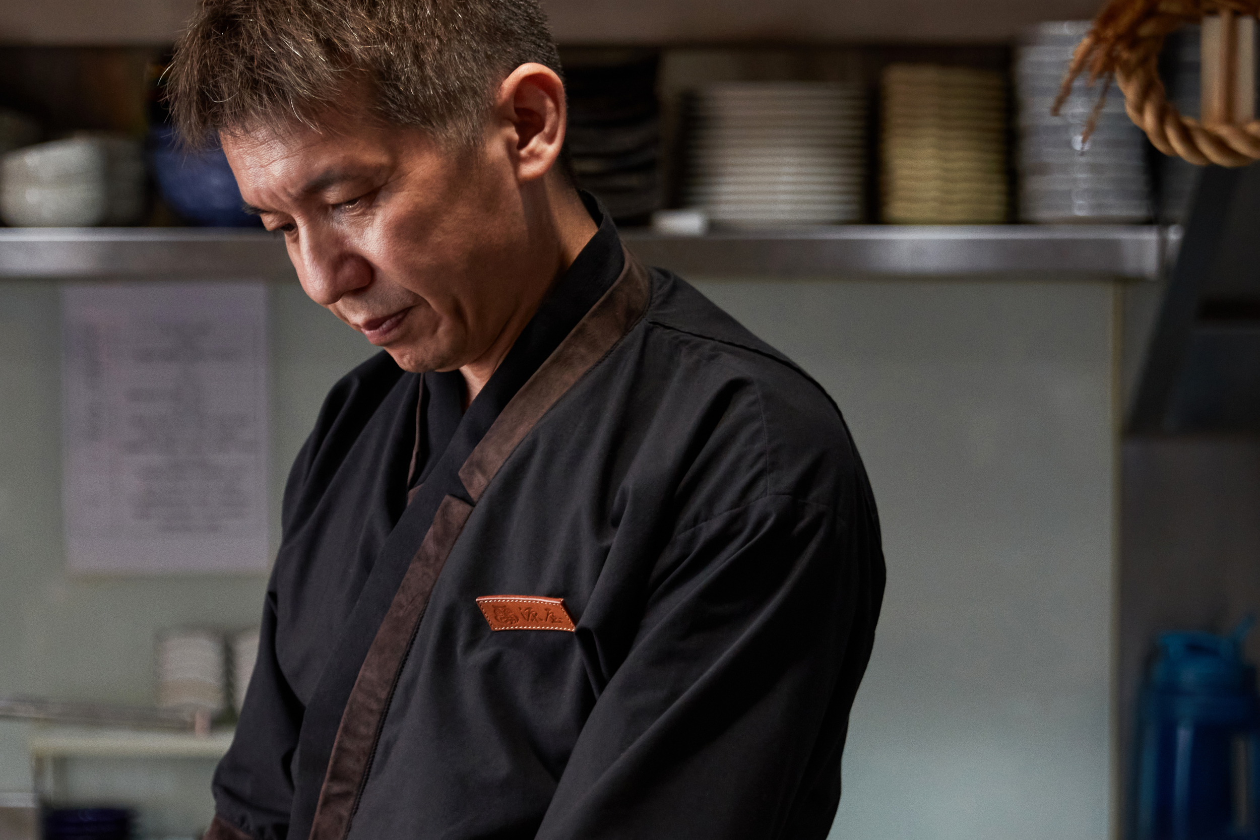 源屋 匠和食的訂製品,日料作務衣領片、袖口、口袋緣使用磨砂羊革點綴,低調並製作出設計細節,店徽別針則用於每個員工使用。