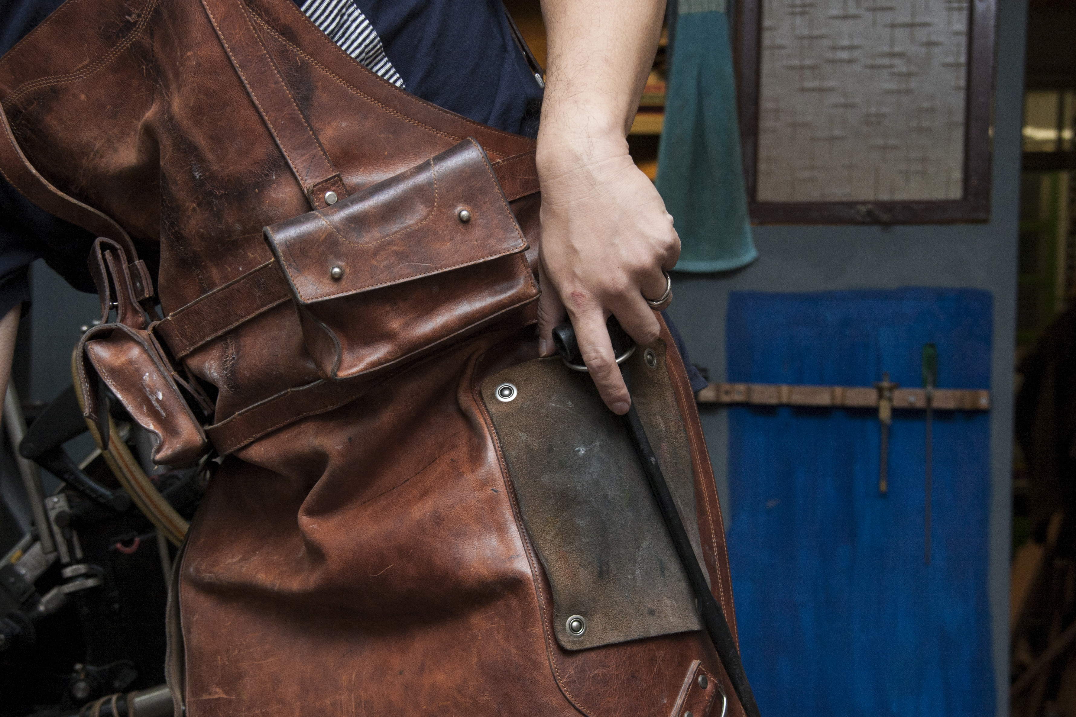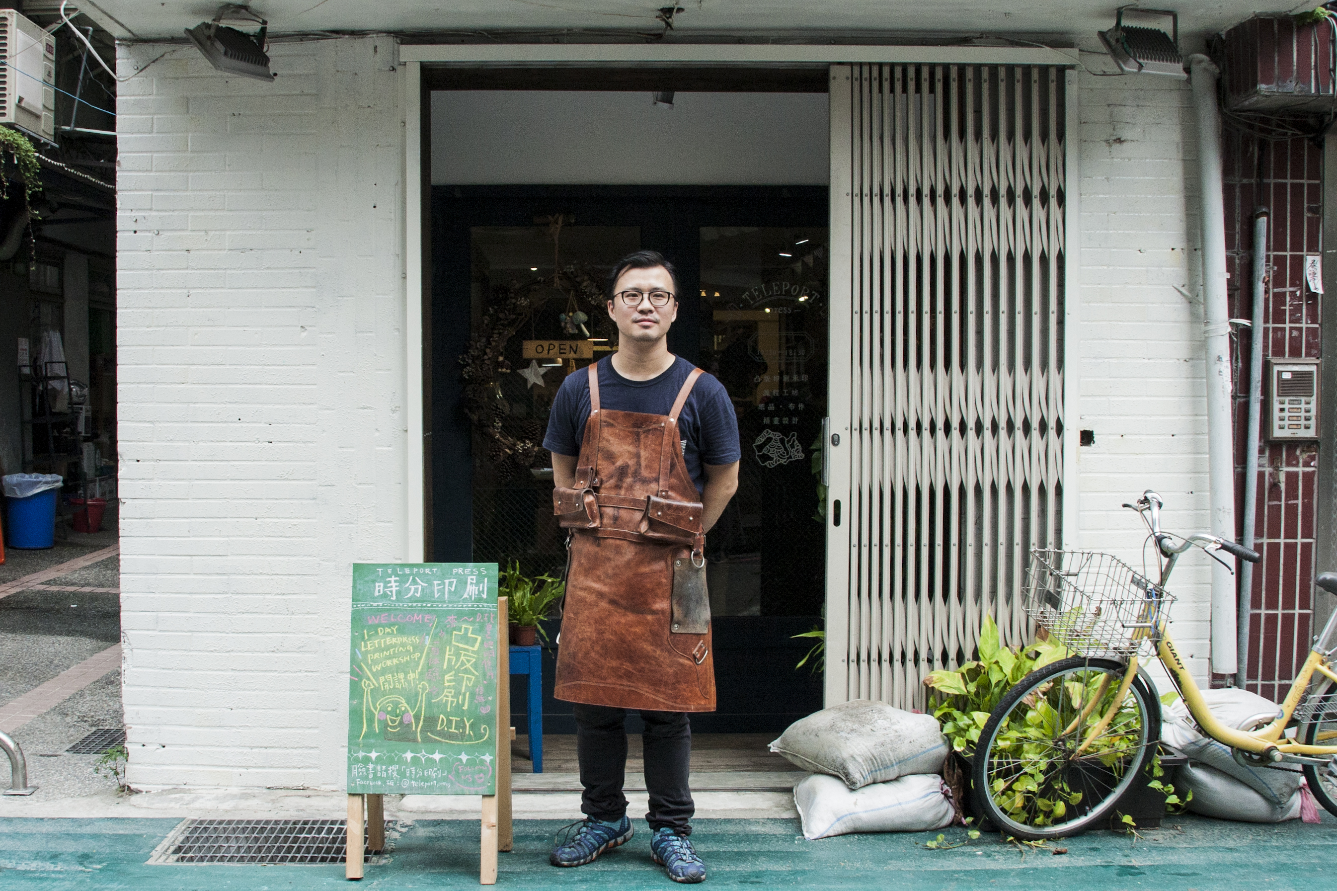 時分印刷 Teleport Press-湯舜的特製工作圍裙,使用全皮革圍裙增加耐用度,常使用的工具及零件,則置於活動式的掛盒內。由於手上常有拆裝零件而沾染的機油,特別將拭布固定在腿部兩側,方便擦拭。並使用價格相對較頭層革低的二層革,製作可替換拭布(皮),亦可裝上一般的抹布。
