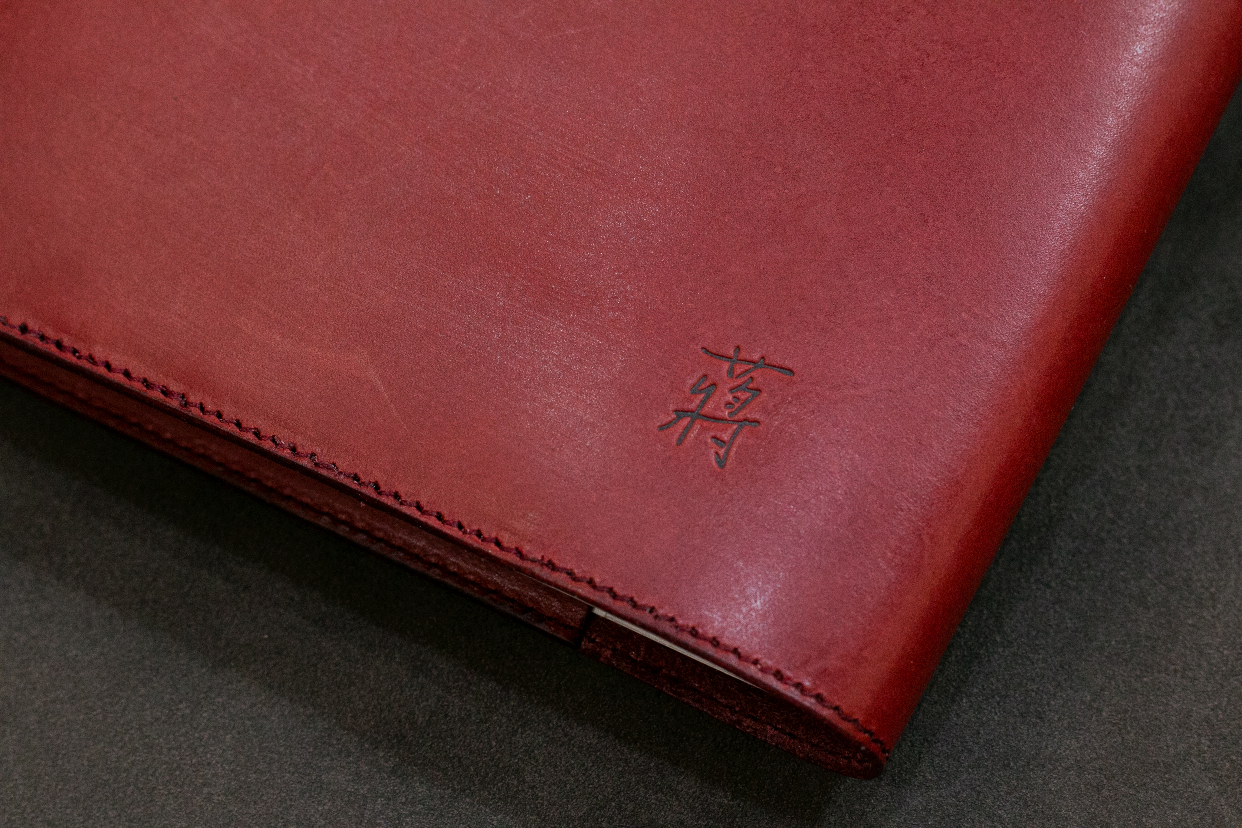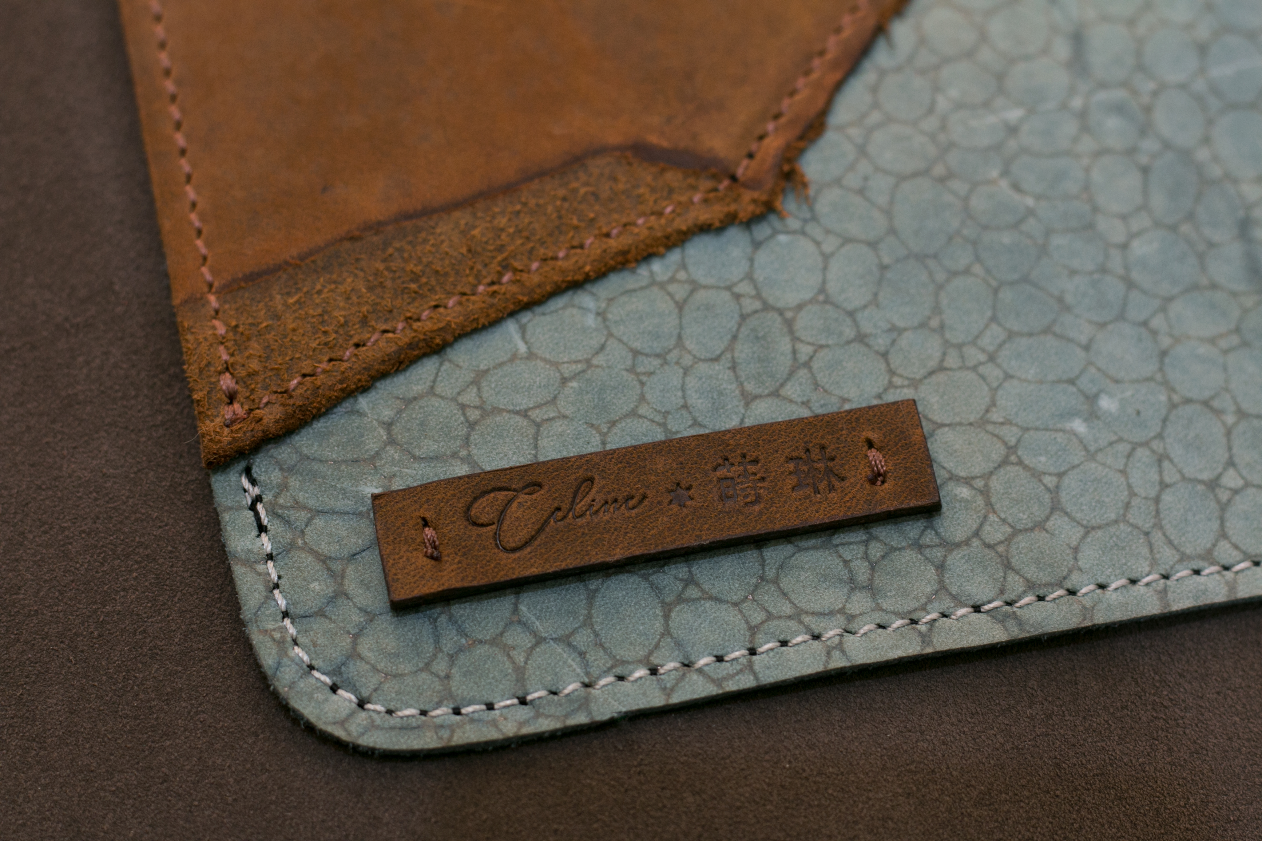 「涵葳的鋼筆」使用涵葳本人的手寫字開模製作,筆蓋縫份的邊緣處理使用「亮面透明油邊」,使其與霧面皮革產生反差,製作出畫龍點睛的效果。