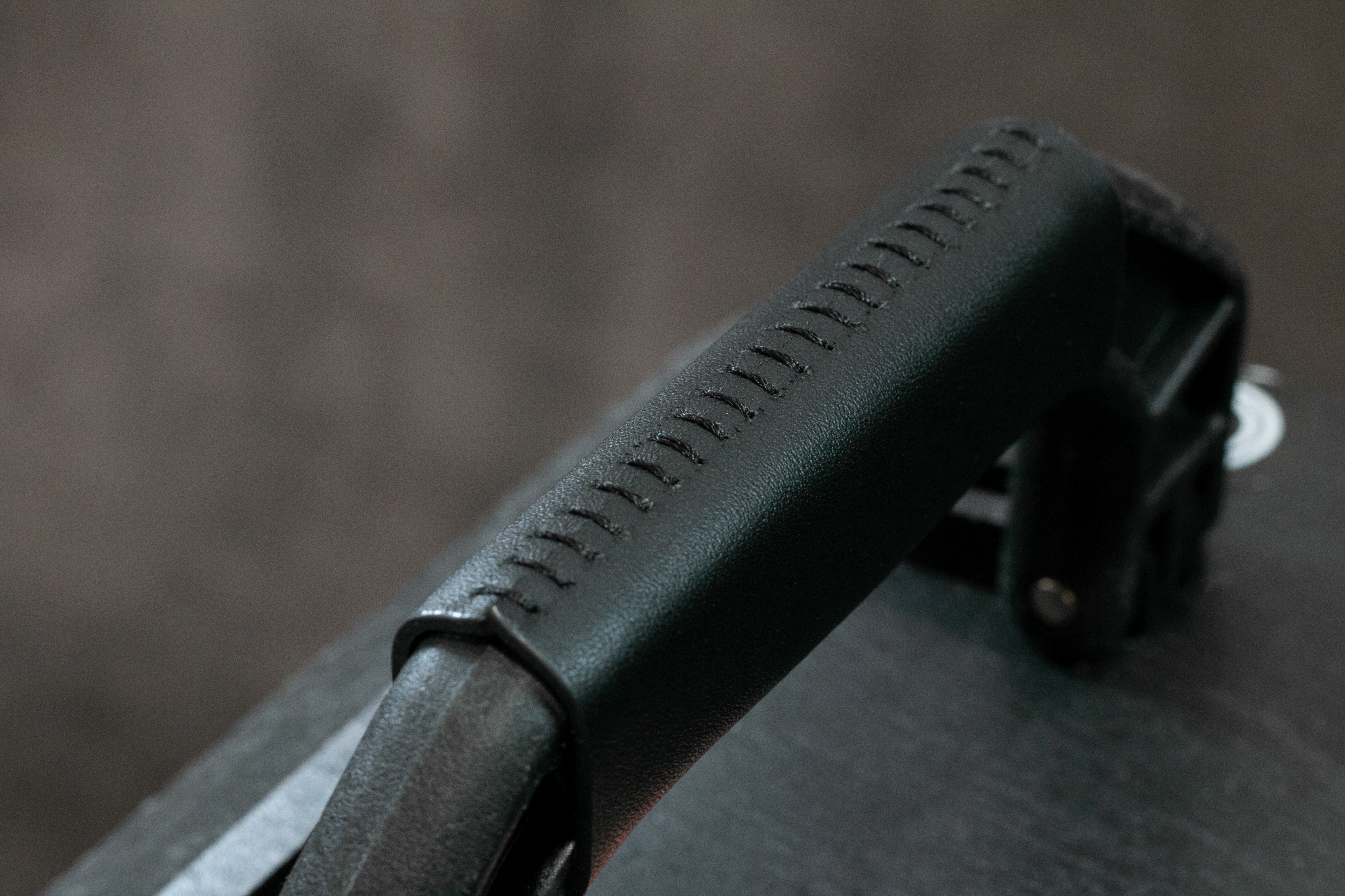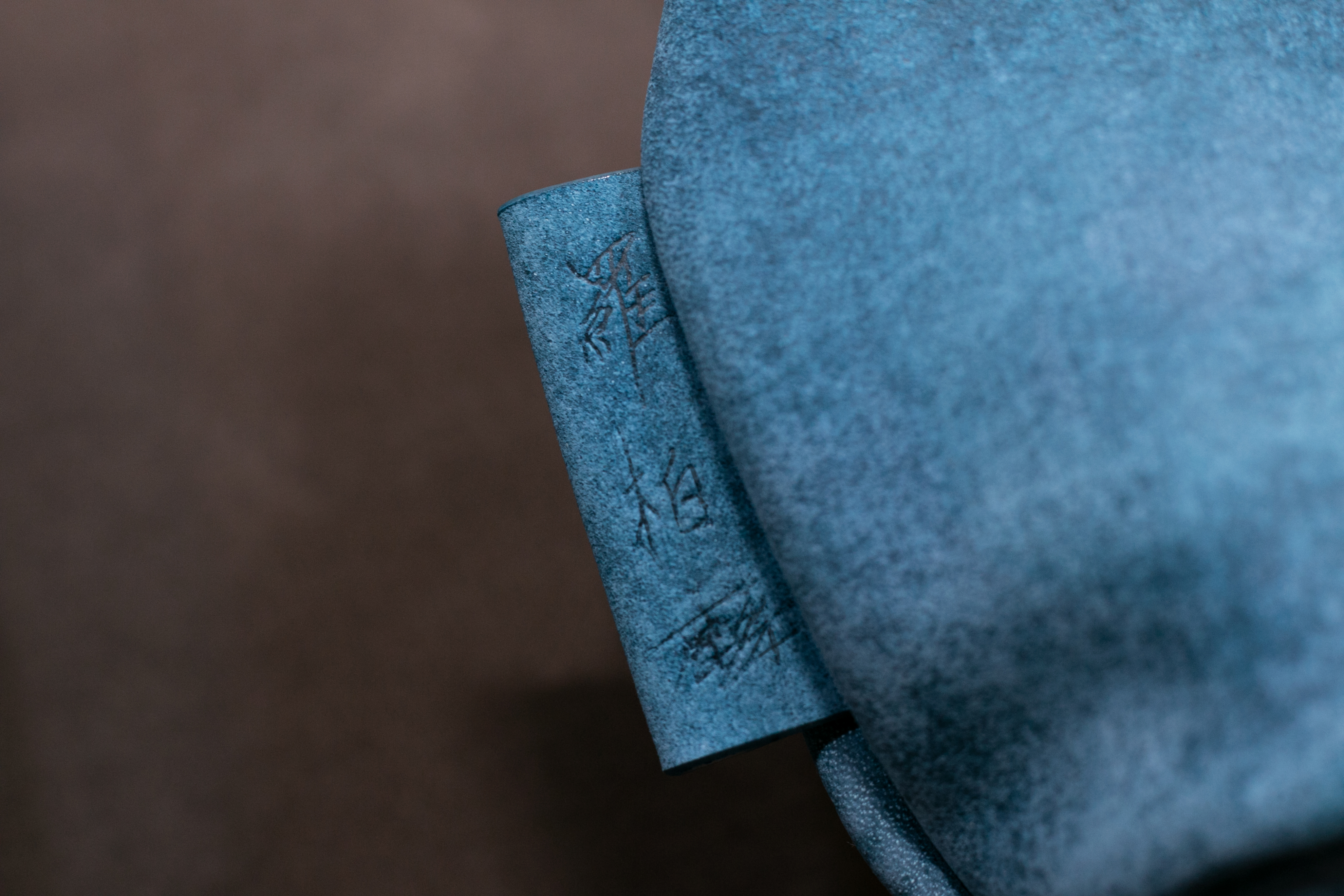 王涵葳(多麽)的訂製品,使用軟度及彈性較大的潑墨黑磨砂革製作黃銅鋼筆蒙皮,握筆舒適度佳。原始鋼筆為圓筒狀,平放於桌面時易滾動,因此在筆蓋處的蒙皮將縫份製作於外部,放置於桌面時鋼筆不易滾落。