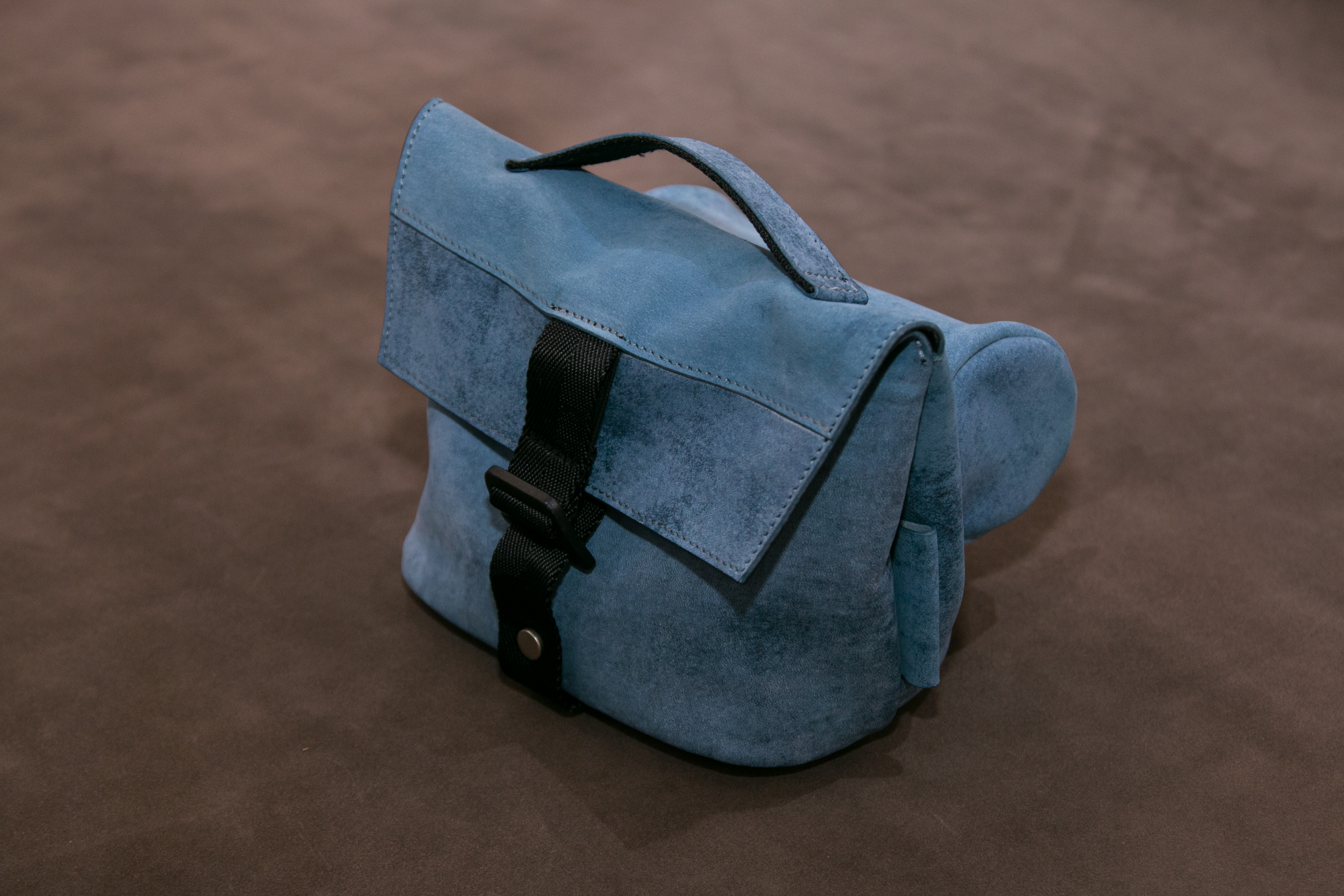 攝影師 BOLIN 羅柏麟的訂製品,BOLIN 隨身備有一台徠卡底片機,隨時拍下當下有感覺的相片。這次挑選特殊的水洗牛仔感磨砂革(Nubuck)以及柔軟的豬二層面皮做為內裡,製 作隨身相機包。主體包外使用 MOLLE 模組化的方式製作可拆式的外接小包,可裝兩個底片 盒及一個小機頂閃光燈。