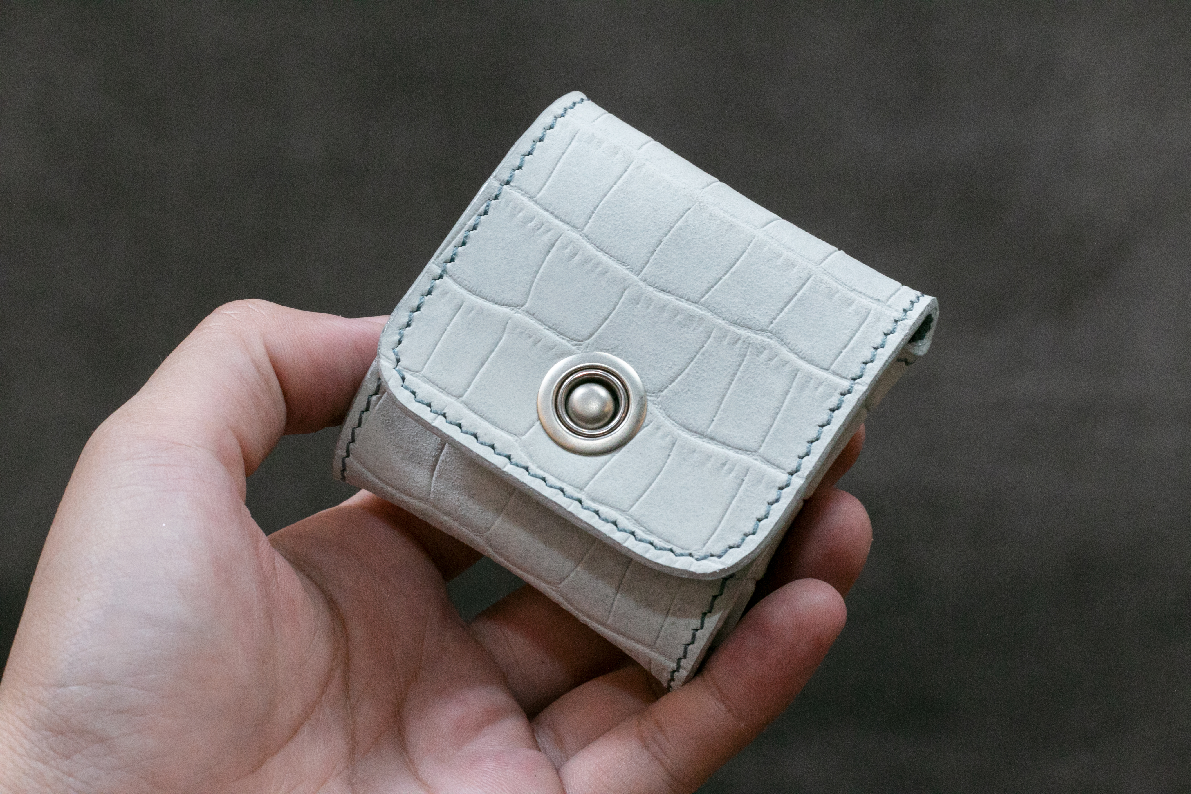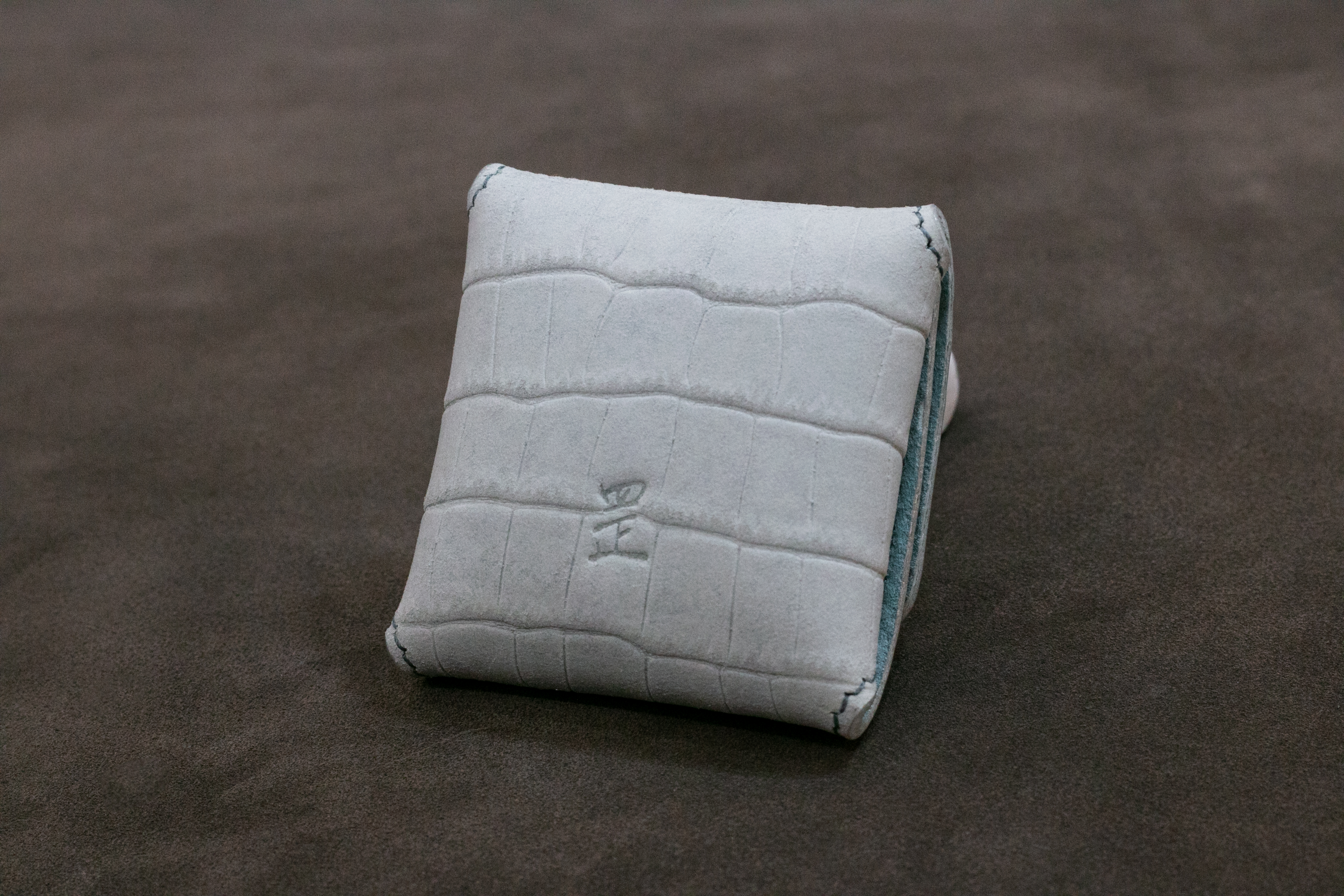 許罡愷的訂製品,使用特殊的白灰色磨砂鱷魚紋牛革製作松香(註1)皮套,並使用水藍色豬反毛面皮製作內裡及包覆松香的皮革。