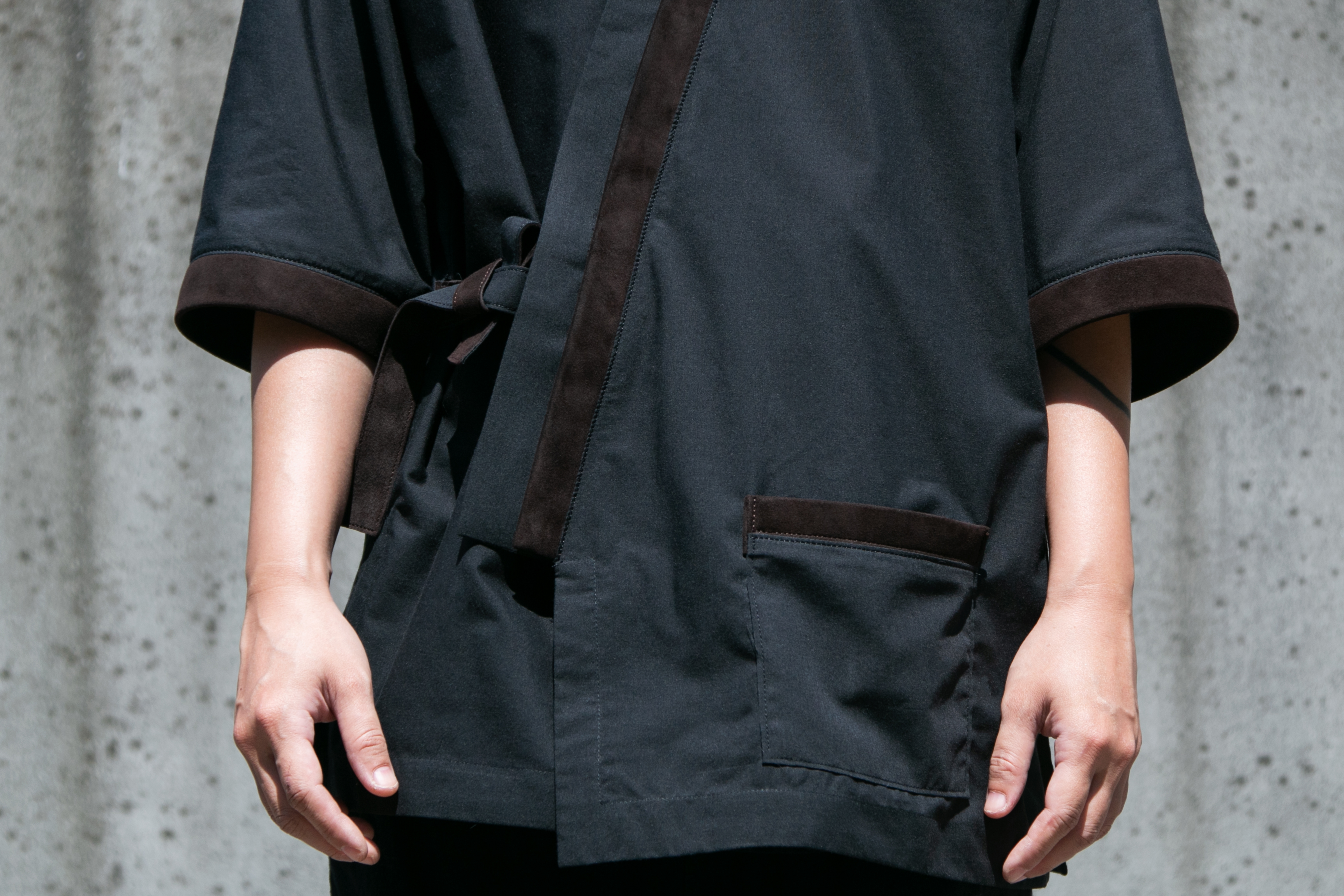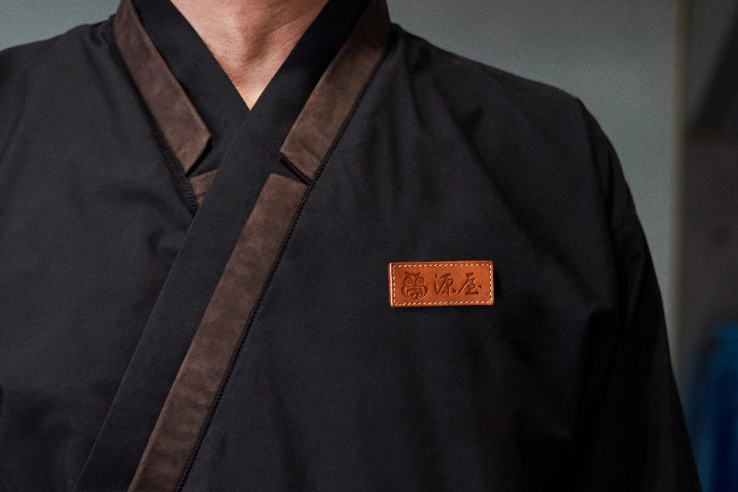 源屋 匠和食的訂製品,日料作務衣領片、袖口、口袋緣使用磨砂羊革點綴,低調並製作出設計細節,店徽別針則用於每個員工使用。