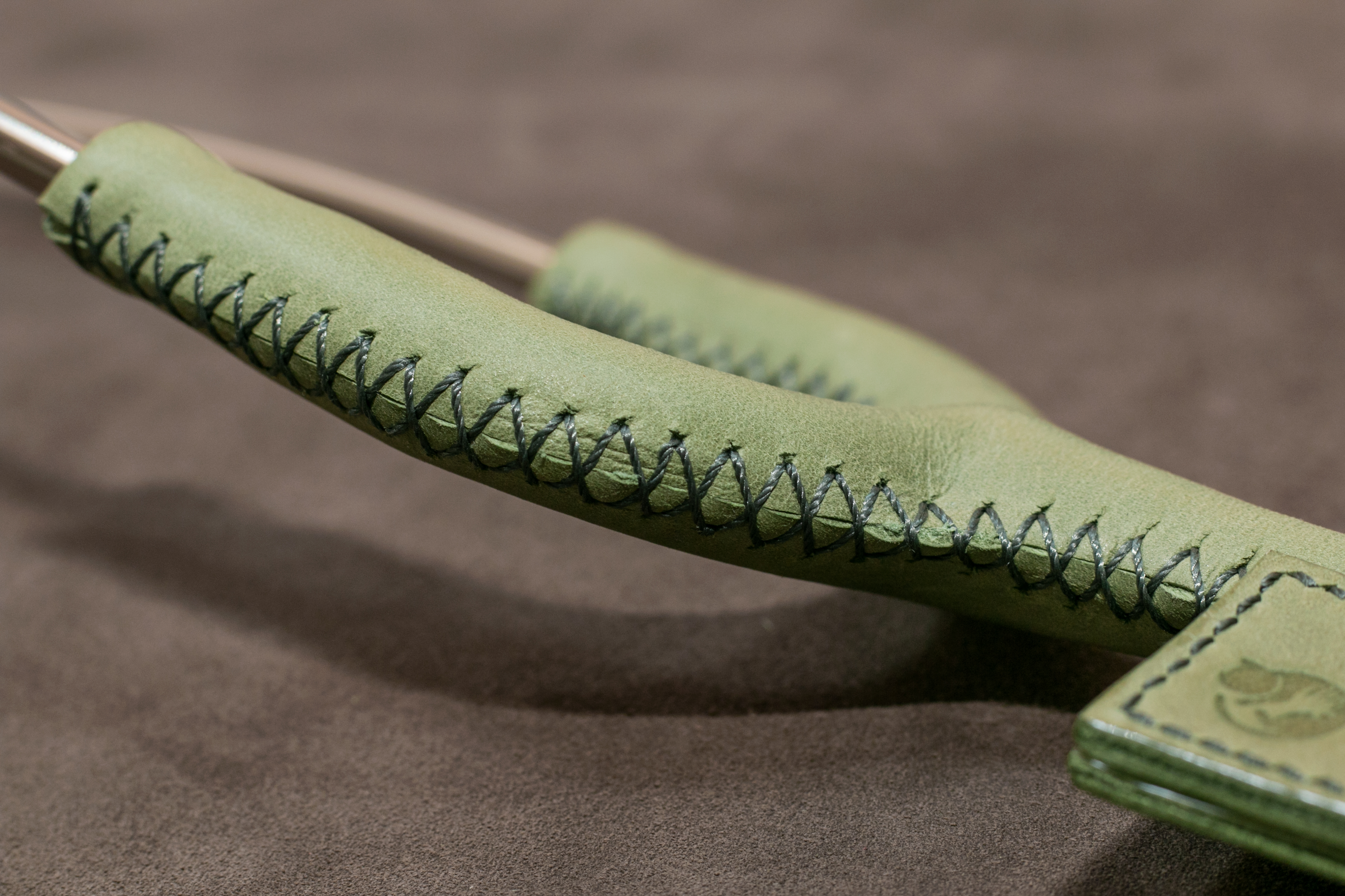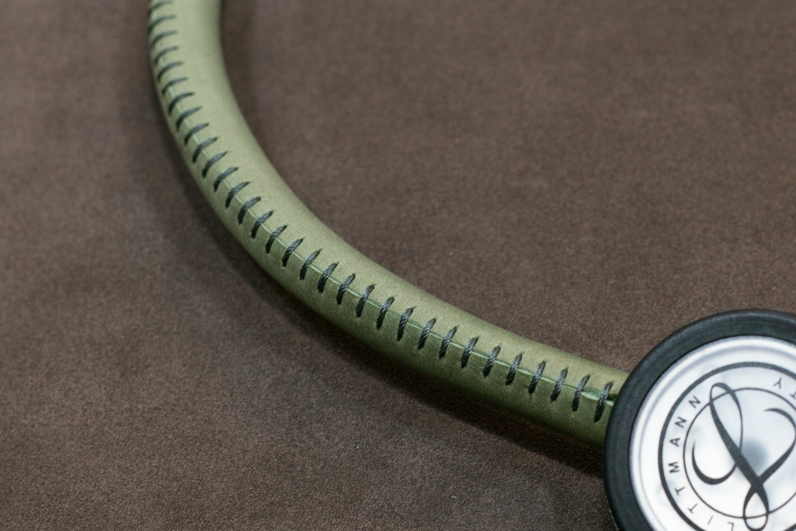 這次比較特別的是聽診 器的蒙皮,因材質為橡膠軟管,Y 字型處的管徑亦非統一管徑,在製作上難度較高。另外,由於聽診器的軟管是非常軟且有彈性的,為了保有這樣的特性以便使用,皮料的挑選則是選擇較具彈性且柔軟的皮革。