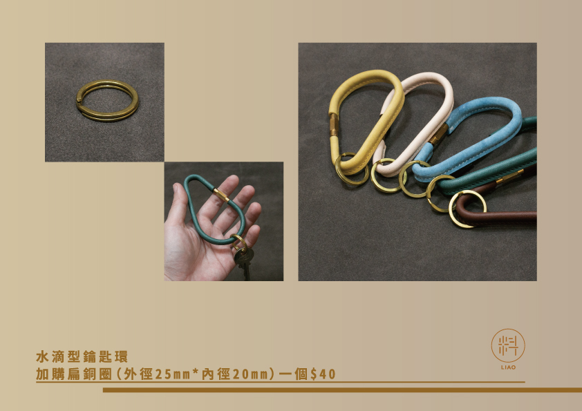 做工精緻的水滴型鑰匙環來囉!以蒙皮(皮革包覆)的方式將黃銅製的鑰匙環全面包覆,可以扣上多把鑰匙。每個鑰匙環皆會附一個扁銅圈,如需增加可另外加購。