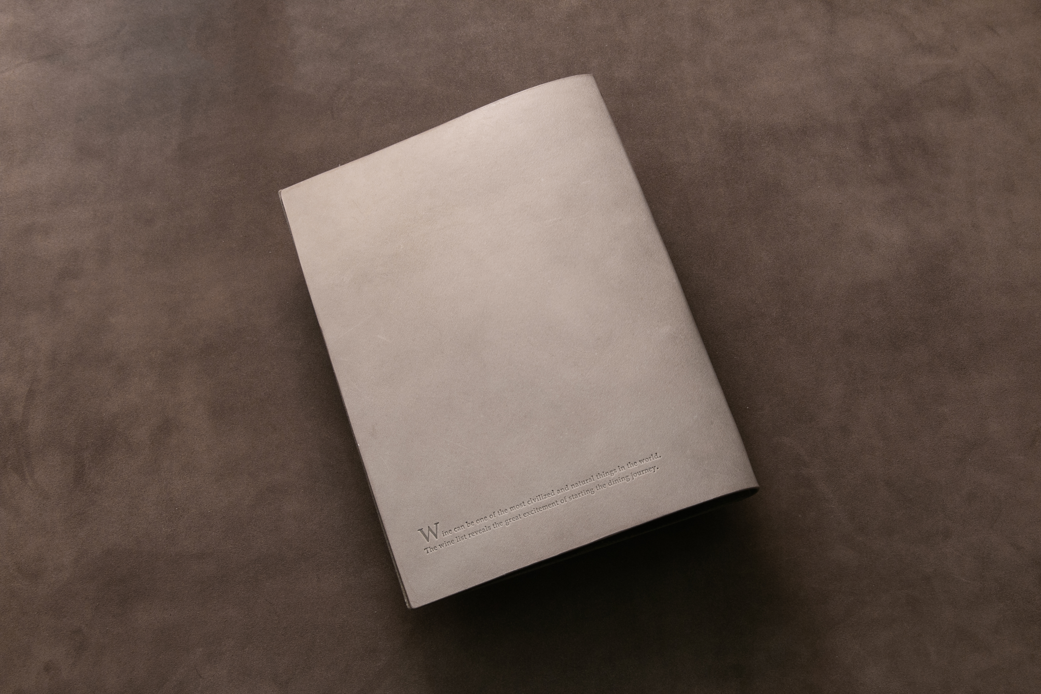法國餐廳A_Taipe酒冊製作,「Restaurant A」由前Raw主廚黃以倫 Chef Alain掌舵,在2023開啟新的餐廳旅程。餐廳酒冊由知名平面設計師森田達子設計,最後交由有料革製設計所製作。酒冊使用大面積烙印LOGO與圖案,在製作上頗有難度,除了烙印位置的準確度,大面積烙印也需要使用大型油壓式燙金機製作。