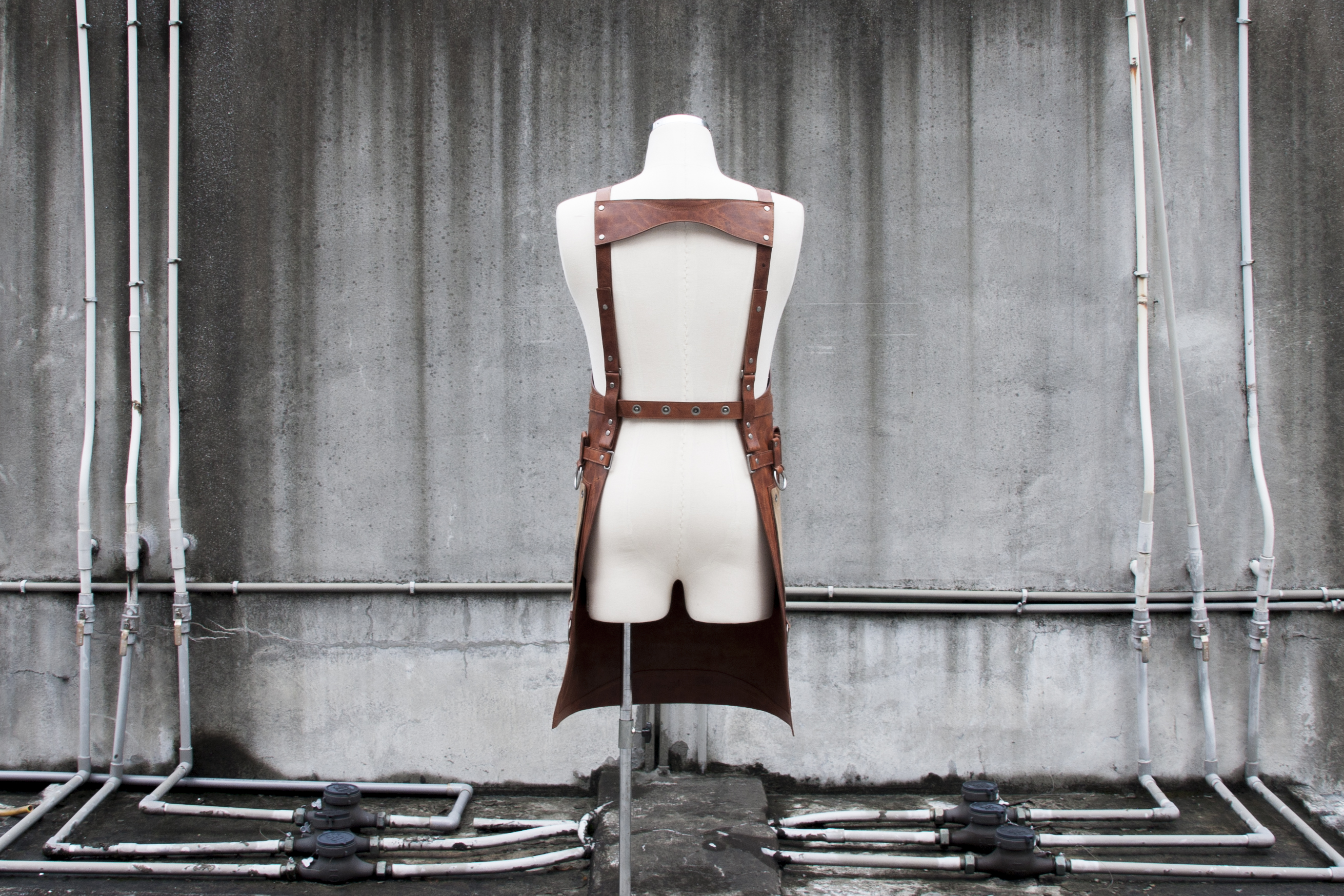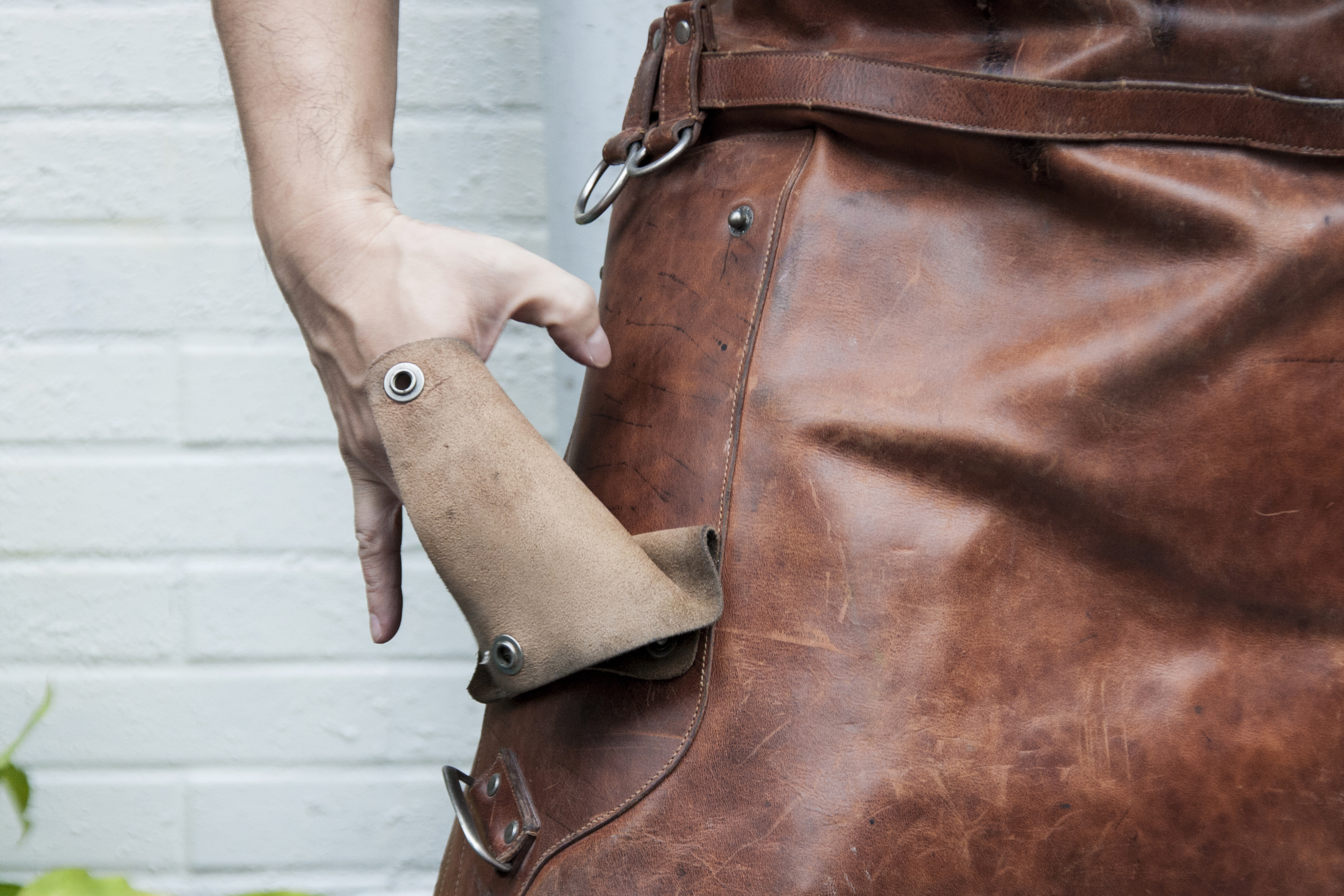 當初與湯舜討論時,建議皮革搭配帆布,但他強調掛置的工具都有其重量(比如勒輪板手),以及其它零零總總的使用需求,所以我們最終以全皮革製作。改善重量問題的部分,則是選擇較薄的油蠟牛革,只做單層不做內裏,目的是讓皮革較快變軟,並減輕一些重量。邊緣及結構處,再以皮革貼邊車縫處理,目的是增加結構強度,讓整件圍裙不因過薄而容易變形。