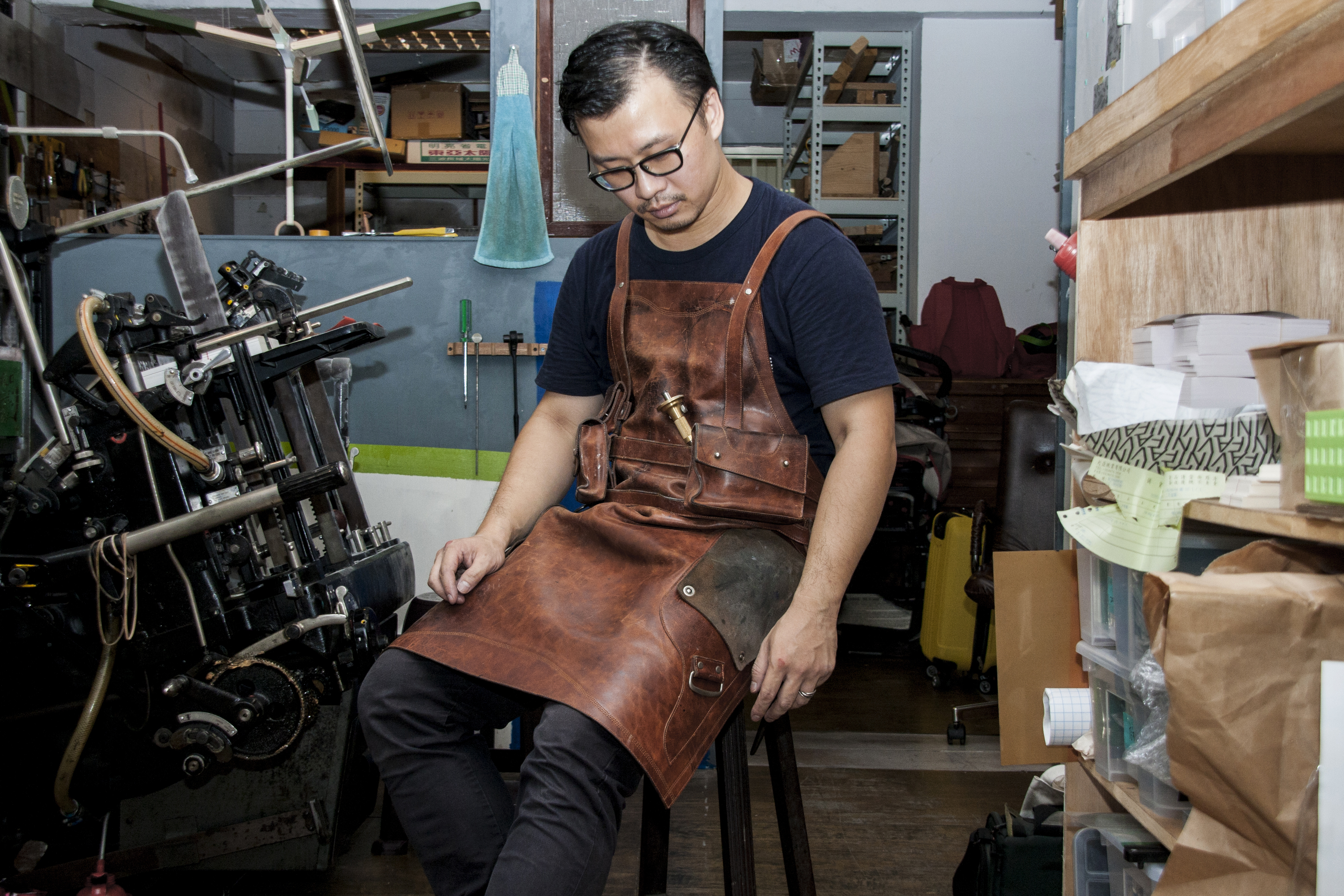 時分印刷 Teleport Press-湯舜的特製工作圍裙,使用全皮革圍裙增加耐用度,常使用的工具及零件,則置於活動式的掛盒內。由於手上常有拆裝零件而沾染的機油,特別將拭布固定在腿部兩側,方便擦拭。並使用價格相對較頭層革低的二層革,製作可替換拭布(皮),亦可裝上一般的抹布。