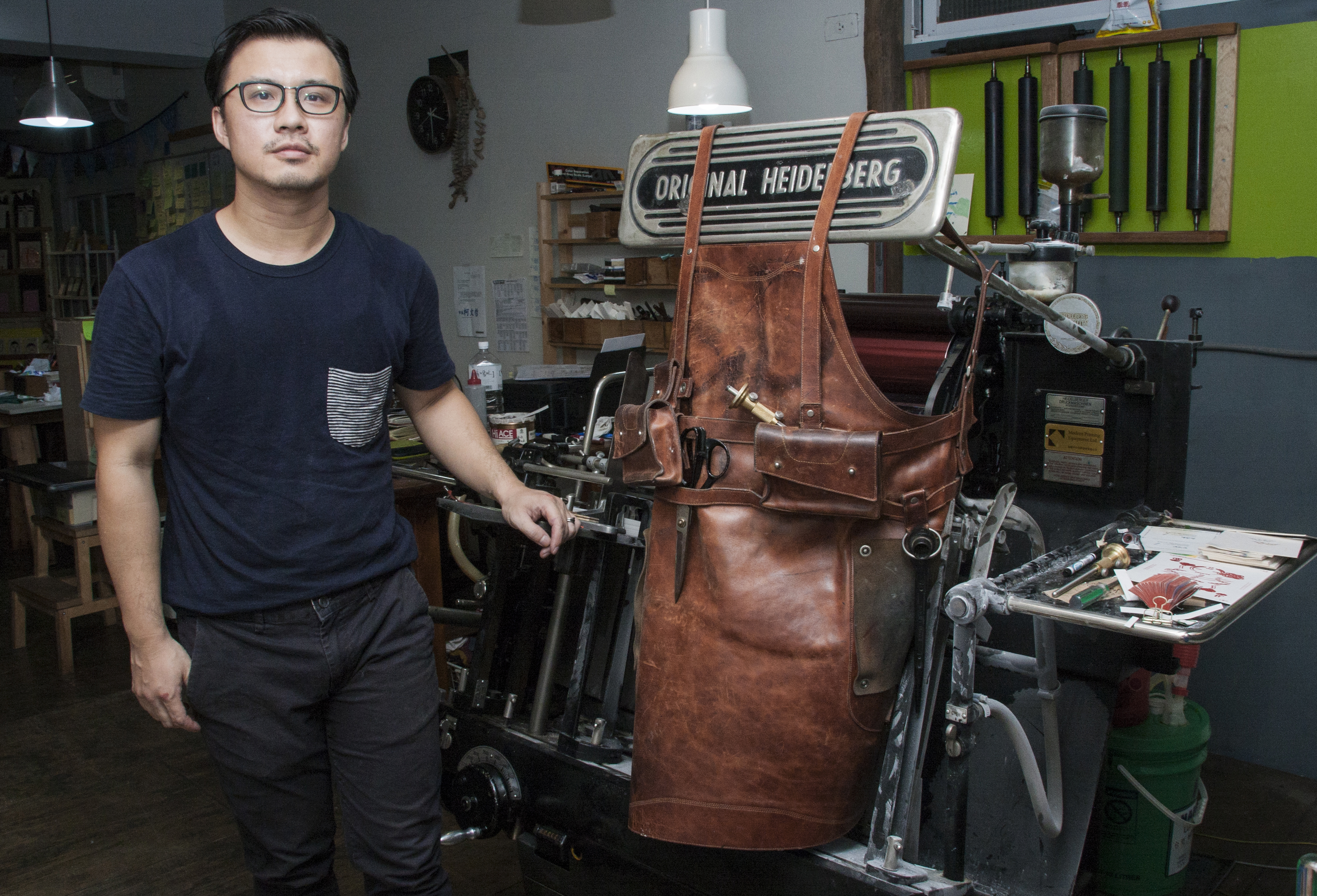 湯舜平時會將圍裙掛置在這台印刷機上,它是重逾一噸的「德國海德堡-風喉照鏡」凸版印刷機。執行技術相關的工作時,再穿起它。