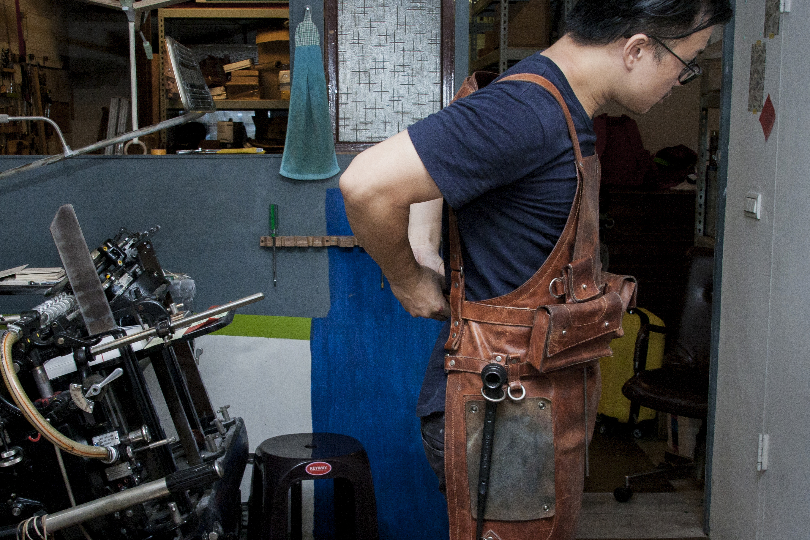 穿脫方便的圍裙,只要套上它,再扣起腰部的鈕釦,便完成著裝;並依當下的工作項目,佩戴相關的工具。隨時隨地拿起需要的工具,即時調整印刷機,做出精準的印製。湯舜:「每次開始印製的時候,都要做鬆開、轉緊螺絲的動作十幾次,勒輪板手在腰間會很方便。」