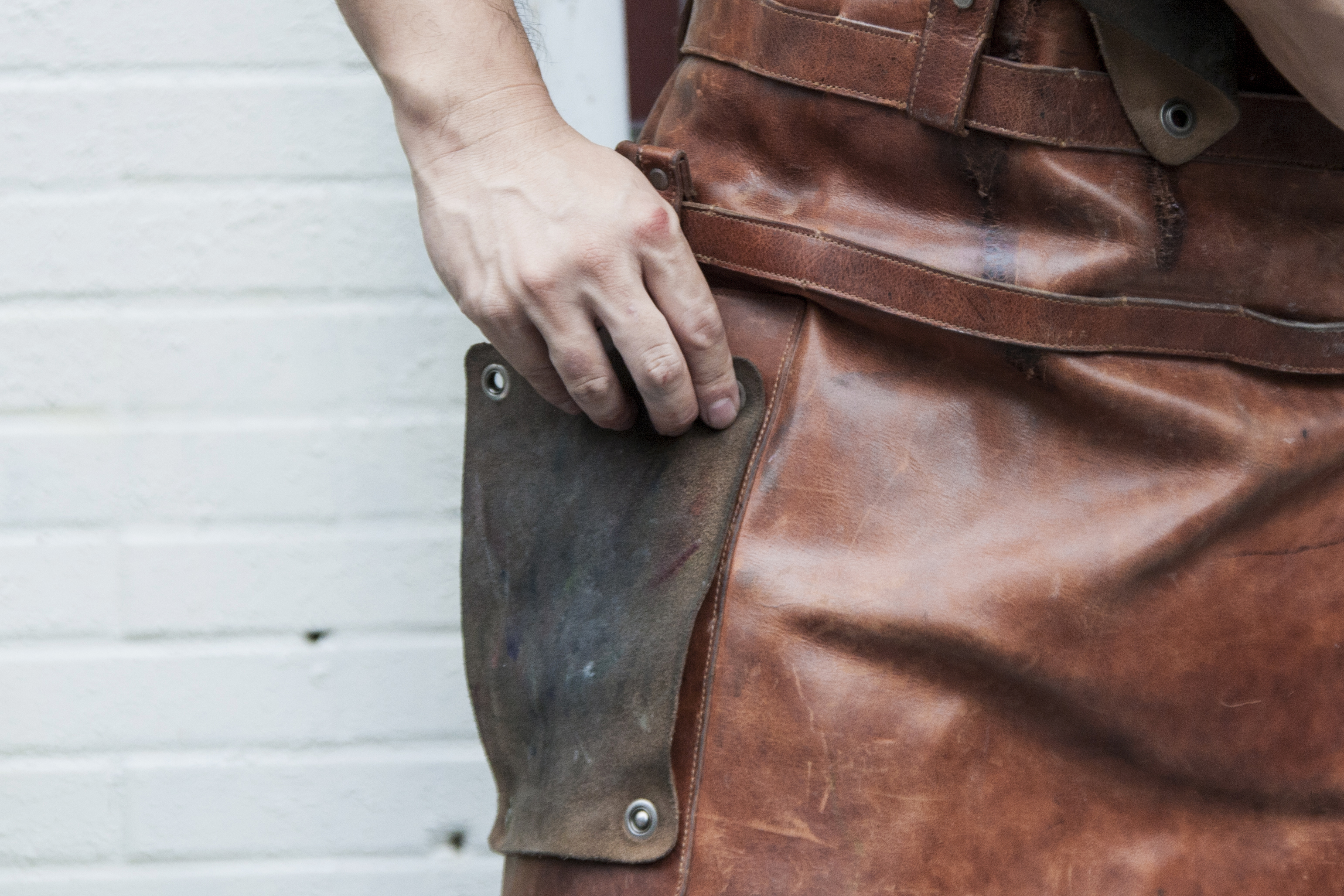 全皮革製的圍裙,有重量較重、剛開始使用時較硬挺、坐下時較費力的缺點;優點則是不易捲入印刷機,掛上較重的工具時,也不會讓整件圍裙變形,硬挺的問題則是使用一陣子皮革就會變軟了。