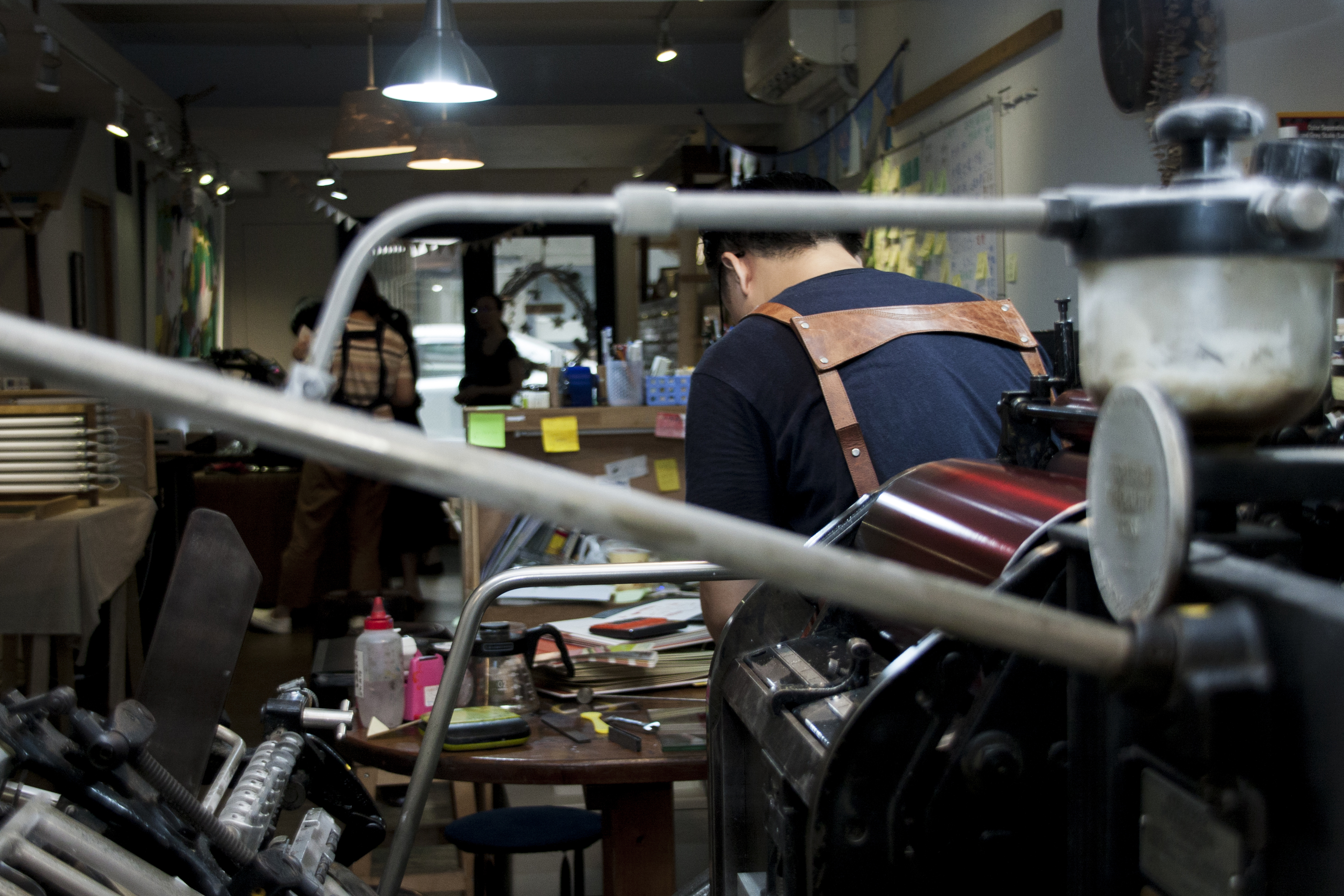 最大台的「德國海德堡-風喉照鏡」凸版印刷機,放置在工作空間的底部,店門口則是有小台的印刷機,供工作坊使用。湯舜平時在這邊操作機器,並與訂製印刷品的客人討論;前面則是有工作人員負責工作坊的教學。
